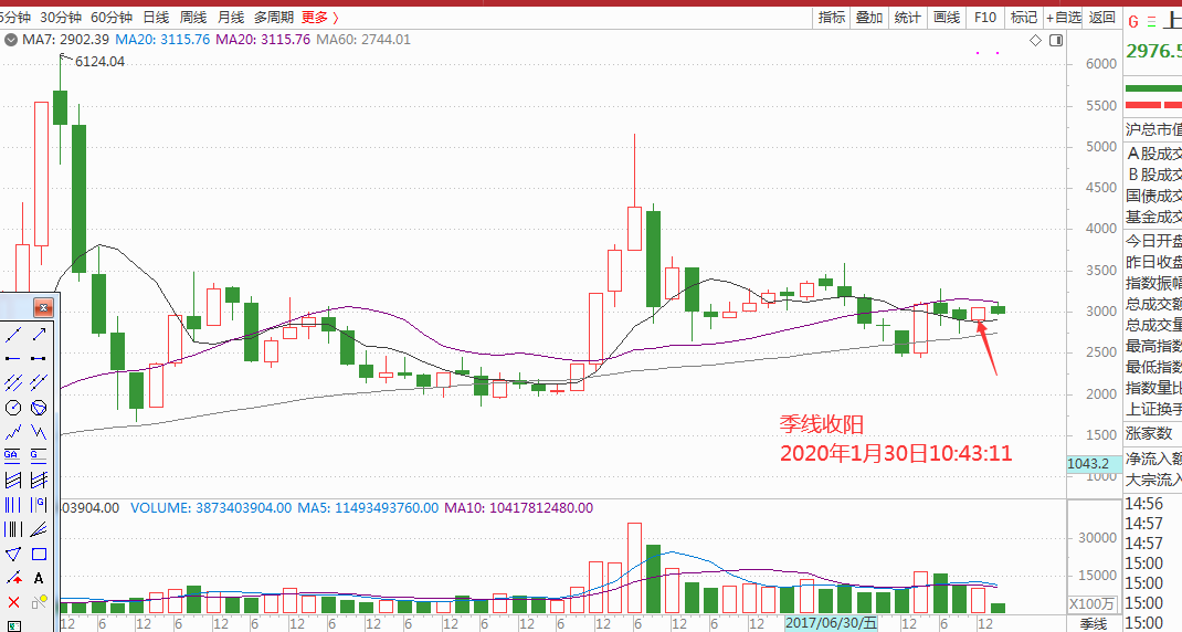 、周线、月线收阴,那么下个月2月份也会受到影响收阴的可能性增加,那么我们看稍微大的周期季度线,季度线收阳,大概率第一季度会收阳,按照道氏理论小周期屈从于大波段,也就是说在第一季度之前允许有回调行为,如图: