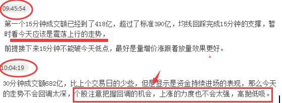 早盘的15分钟成交量显现出进攻的势头,成交额达到418亿,而且第二个15分钟依旧是上涨形态,成交额682亿,这样的成交额基本属于温和反攻的量能结构,所以给的建议是震荡偏多,不会下破大跌,安心做高抛低吸,如图: