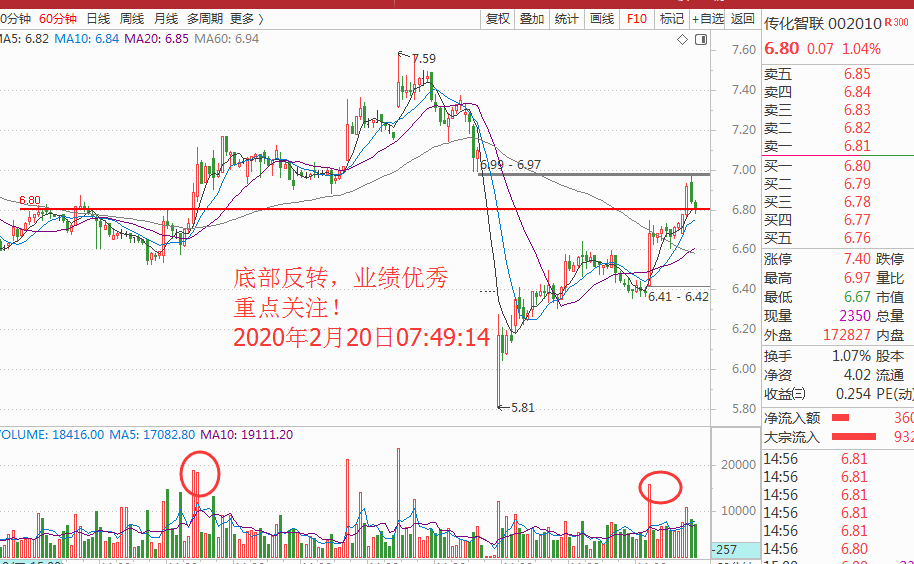 工业和信息化部办公厅发布关于运用新一代信息技术支撑服务疫情防控和复工复产工作的通知。支持工业电子商务企业和物流企业高效协同,运用互联网、大数据、区块链等技术完善智慧物流体系,相关公司:传化智联002010,技术上已经有底部翻转的形态走出来了,业绩预增104%,可以重点关注,如图: