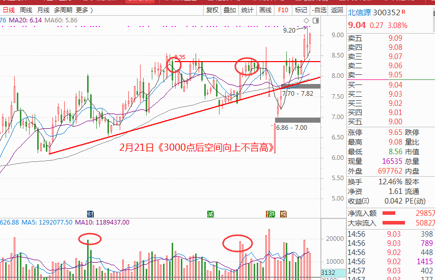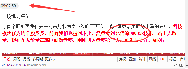 券商个股前面我们关注的东财和南京证券昨天再次封板,继续启用跟踪止盈的策略,科技板块优秀的个股多多,前面我们也提到不少,复盘看到北信源300352技术上站上无敌量,现在在无敌量震荡区间做盘整,刚刚进入盘整第三天,可重点关注,如图: