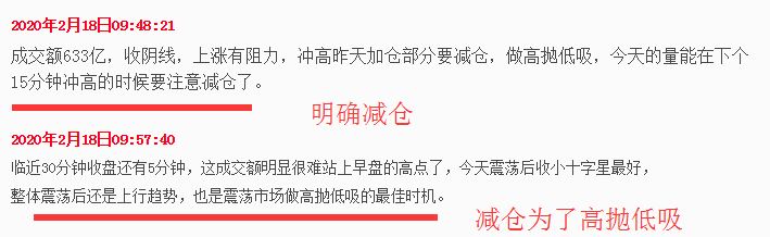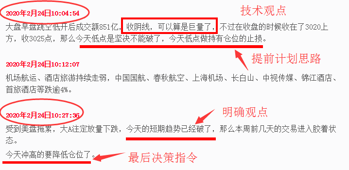 第三次是2月24日再次出现无敌量放量阴线这次就是孙子兵法所说的一而再再而衰,再次出现就是衰竭的迹象了,首选通过技术研判巨量阴线要减仓,接着给出计划今天低点不能破,破了要止损,明确说明短期趋势已经破了,今天冲高要降低仓位了,如图: