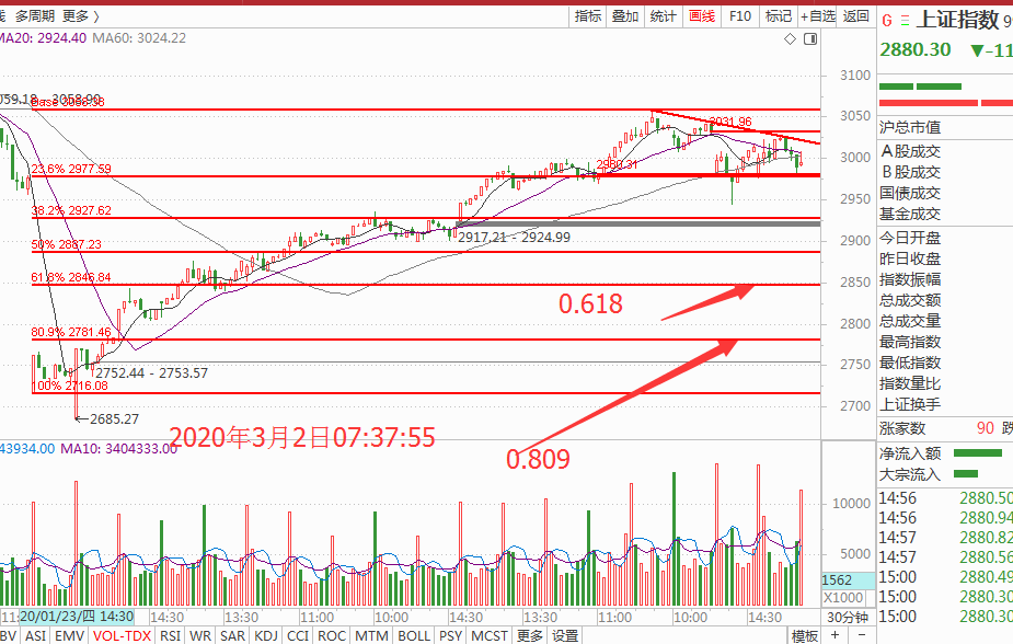 而技术上回调的低点就是在前面一波涨势的0.618位置,最疯狂打到0.809位置,点位0.618位置是2827点,0.809位置是2758点,如果去掉开年第一天恐慌低点那么在2781点止跌是标准点。如图: