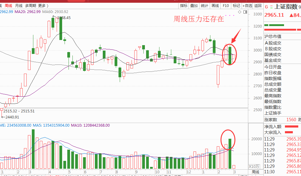 技术上创业板、中小板截至目前看是完成了一次对日线级别60均线的回踩,今天主板是在大夹板震荡区间上攻,我们看如果今天收盘保持这形态,那么一根阳线现思路要转变,按照二分之一法则,回调一半反弹也是正常,但是切注意周线级别的压力位很重,在没有上攻突破的情况下是坚决不能大意的。如图: