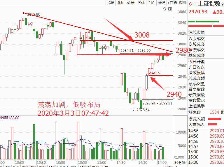 技术上昨天的技术形态涨幅已经吃掉了上周五大阴线的三分之二,缺口一步之遥,那么我们就把这个K线界定为多空分界线,也就是说接下来的震荡会在昨天阳线上方进行,细分压力和支撑位置在小级别的支撑点2952点和2940点,压力位就是前方跳空缺口3008点附近,如图: