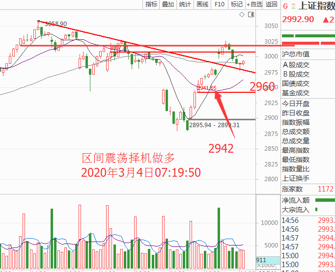 技术上昨天再次放巨量,跳空缺口昨天一日回补,真阳假阴线,技术解读为,上攻有心量能稍逊一筹,上攻途中遇空头狙击才收阴线,这个阴线的量之下和周一阳线量之上区间震荡加剧是必须的,具体点位支撑第一点2962点,第二点2940点,2940点是无敌量上攻的强支撑,鉴于2月24日已经在30分钟下破趋势线30分钟周期,操作上要保守,如图: