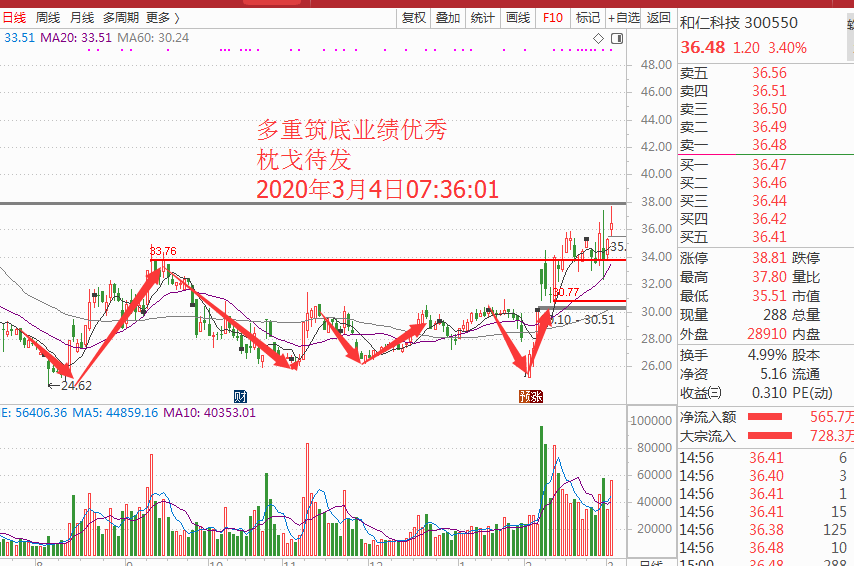 医药股昨天表现抢眼的也就口罩概念,最终科技股还是主力军,昨天科技股软件行业板块表现不俗,和仁科技300550构筑了多重底,业绩扭亏表现优秀,可以重点关注,如图: