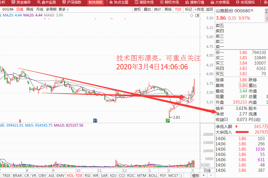 山推股份这个技术图形漂亮的无敌量上破,业绩一般,但是每年都是递增的这点就不错,后续可以关注一下,如图: