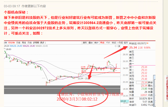 3月3日《建筑行业新晋,业绩形态一个不能少》重点关注的科安达002972完美封板,恭喜关注的朋友们:如图: