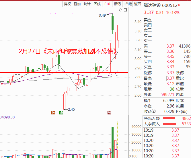 2月27日《未雨绸缪震荡加剧不恐慌》重点关注的腾达建设600512完美封板,恭喜关注的朋友们;