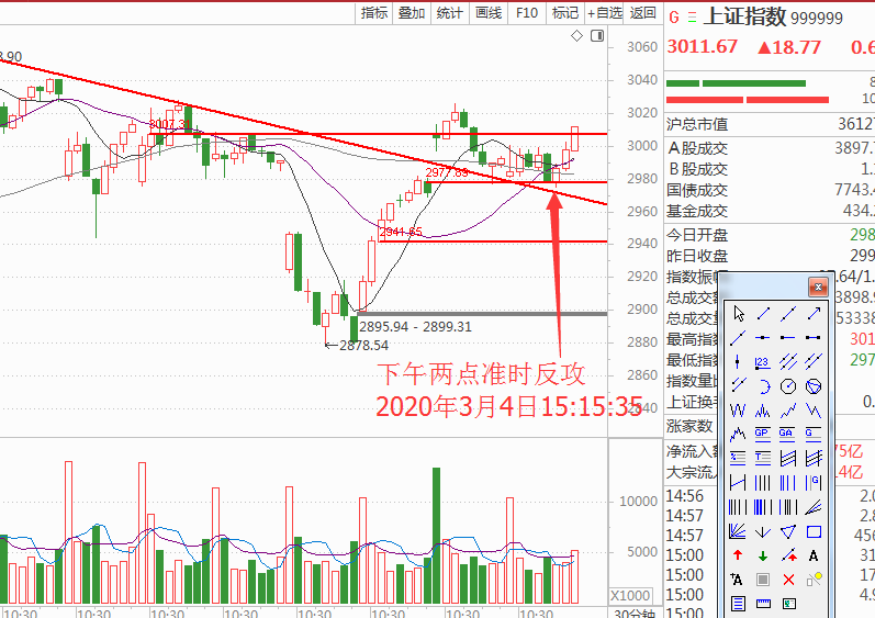 下午盘面做了个小小的回调,当时在直播中回调了周二向上跳空的缺口位置2976点附近,时间也是在下午2点钟达到了这个位置,但是根据上午量能结构今天是震荡行情偏多,这个在直播时候在9点15分钟讲了,大家可以回看。