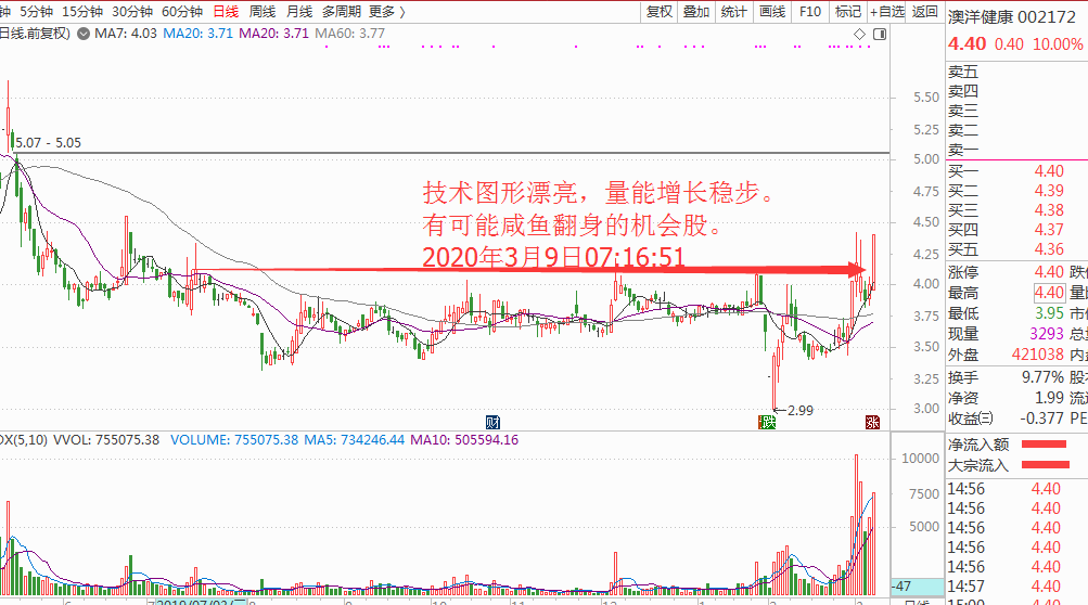 纽约方面对中国进口放开特别是医疗相关 ,不是我表述不清楚,大家能看懂就可以,很多敏感词句不说大家清楚不要出现在文字里,相关公司筛选出来的十几家,但是多数已经涨幅翻倍了,避免追高站岗,只选其中一家刚刚启动的,虽然业绩不好,但是没准能咸鱼翻身了呢,澳洋健康002172业绩负增,但是技术图形漂亮,可按照技术图形做跟踪,如图: