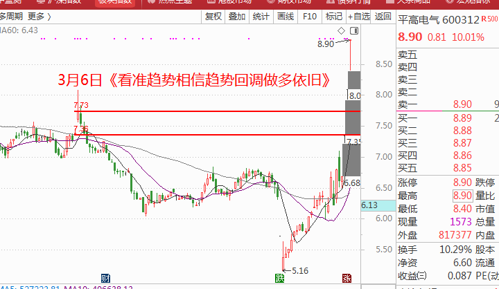 3月6日《看准趋势相信趋势回调做多依旧》,重点关注的平高电气600312今天成功再下一城,冲击涨停板,恭喜关注的朋友们。如图: