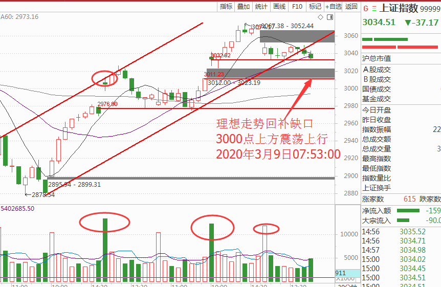 上周在30分钟的3022上方震荡止跌,这个位置是资金周四的进场成本,但是有个向上的跳空缺口,缺口下方点位3012点,这也是我曾经说过逢缺必补的位置,那看来今天这个位置要跳空向下直接补缺口了,还是那句话,早补比晚补好,如果抛开所有消息面影响,技术上补缺口就是夯实底部,所以也不要过于悲观。如图: