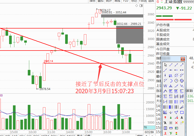 今天偏空是收外围影响,一切以技术支持为依据,只要站上去就大胆做多,其实个股的形态没有走坏,只是走出回踩均线的形态。技术上给出了新的压力位2988点,如图: