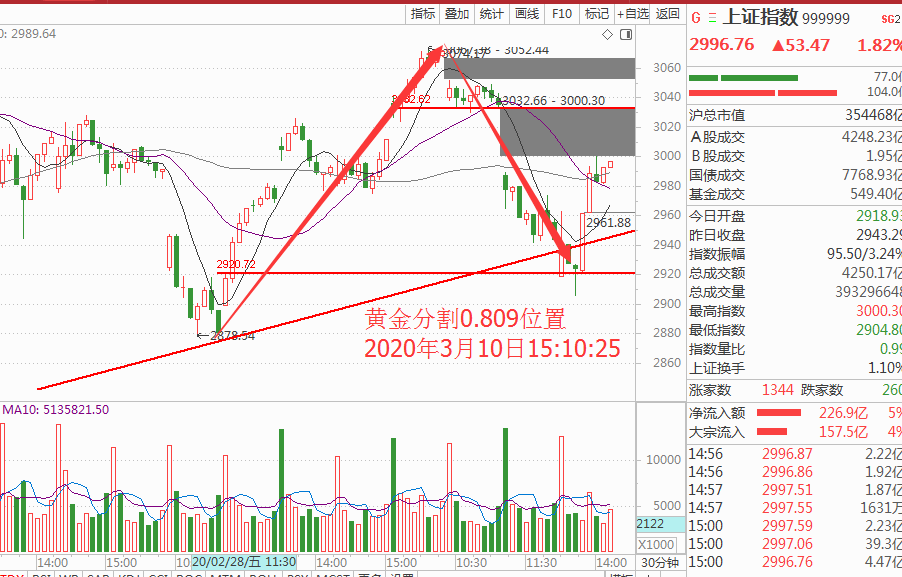 技术上早盘问题和直播都提出来了,这个位置需要确认的信号就是放量上攻,早盘15分钟收盘成交额已经达到了925亿,无疑给了市场信心,盘中虽然底部有下探的行为,但是成交量没有放大,依旧是进场的最佳时机。如图: