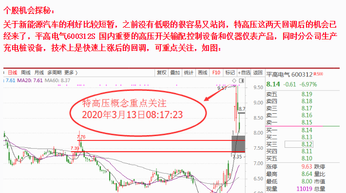 关于新能源汽车的利好比较短暂,之前没有低吸的很容易又站岗,特高压这两天回调后的机会已经来了,平高电气600312S 国内重要的高压开关输配控制设备和仪器仪表产品,同时分公司生产充电桩设备,技术上是快速上涨后的回调,可重点关注,如图: