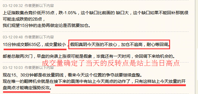 我们再看看3月12日早盘15分钟成交量出来后的观点:5分钟成交额635亿,成交量较小,假阳真阴今天涨的不放心,加仓不追高,耐心等回调。
