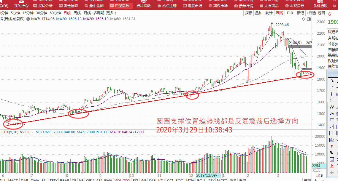 大趋势没有形成那么小级别的上涨也难以维系,大盘走势上证依旧是在大喇叭口区间震荡,相对比较安全,创业板、中小板距离趋势线太近,随时都有再次回踩的可能,所以我们在操作上还是要维持高抛低吸的思路,盘整做出小级别的双底才更加安全,而且历来回踩趋势线的时候都会多次震荡回调确认,如图: