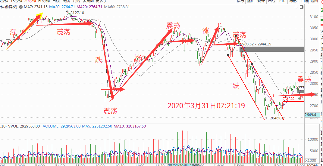 趋势线是最简单的,趋势形成的方向回踩趋势的时候是众多参与者的心里支撑线,所以才有效,当跌破的时候就是所以人的幻想破灭,那就是要止损离场了,后面有机会我们再聊止损的事情。趋势涨变震荡就是有新的方向选择,有跌变震荡也是有新的方向选择,就这背后简单的逻辑清晰了也不会过度恐慌,如图:
