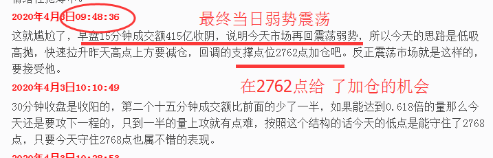 周三观点在早盘量价关系出来之后断定当日弱势震荡个股高抛低吸,并明确会有回调2762点进场的机会到来,如图:
