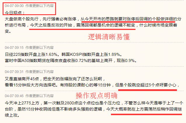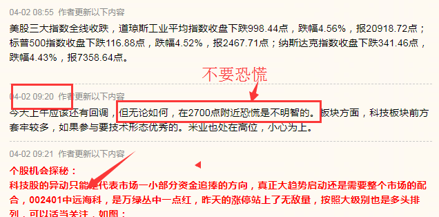先看周二开市,4月2日开盘前受外界影响担心朋友们会把筹码割肉在地板上,所以早盘特别提醒:2700点无需恐慌,相反是机会,结果当天走势绝地反击,如图: