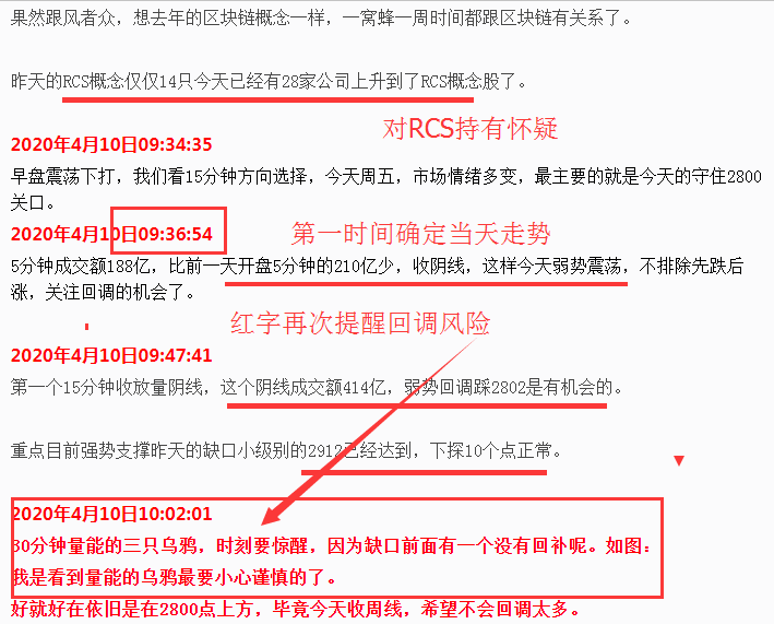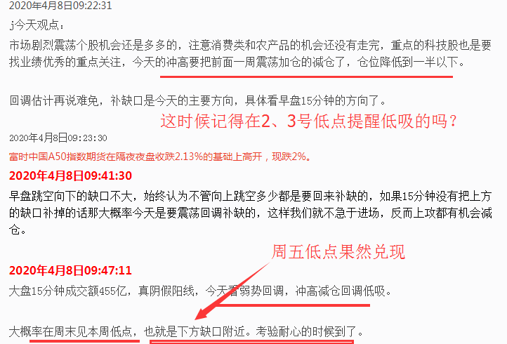 4月8日看到量能不对头,提醒下方缺口没有回补要冲高减仓,并且预见大概率周末会见本周低点,让朋友们考验自己的耐心: