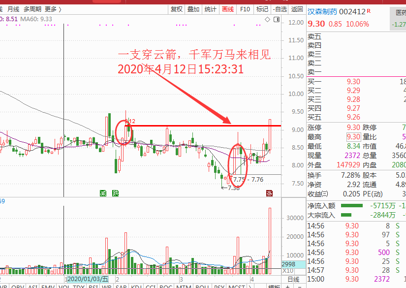 上周板块轮动中医药行业回调居多,但是中药有几个公司异动明显,其中的汉森制药出现了符合我的无敌量信号,在3月25日已经出现了一箭穿心后慢慢有二次一箭穿心,上周站上无敌量是明显主力信号,可以重点关注,如图: