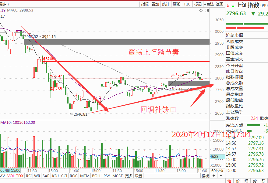 技术上下周有回踩均线2770补缺口的需求,个股板块依旧不会有大作为,再次提醒朋友们:震荡市一定要具有高抛低吸的思路,切不可以为一鼓作气一飞冲天。上涨敢卖回调才敢买,不要问为什么,尝试多试几次就会找到感觉了,如图: