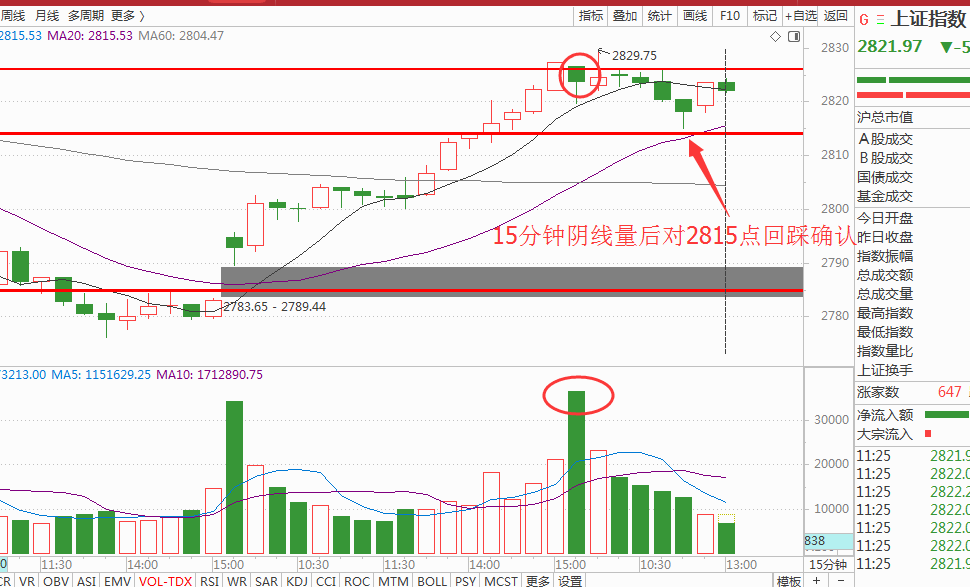 涨涨跌跌踏节奏,计划仓位心不慌。昨天上涨的量是比较稳的,早盘低开震荡中15分钟的成交量注定了盘面弱势震荡。盘中对2815点的支撑位进行第一次的回踩确认,盘中直播说了2815点在之前是压力位,多头站上来就代表着支撑和压力的互换,压力变成了支撑,同时提醒朋友们无需担心回调,不能把当下行情看做牛市,但是也不能偏空。如图: