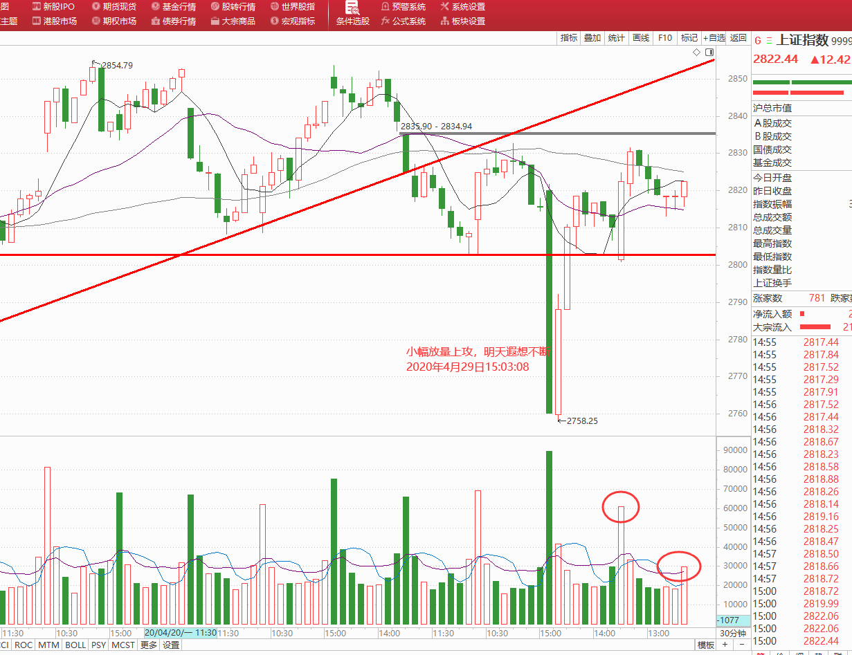 今天早盘是对昨天底部的确认成功,早盘低开后15分钟下腹回调走出放量上攻,15分钟成交量381亿,放量上攻的量能一般般,所以早盘给的建议是趋势上行震荡,冲高会有回踩低吸的机会,盘中最高冲击到3831点后回落。
