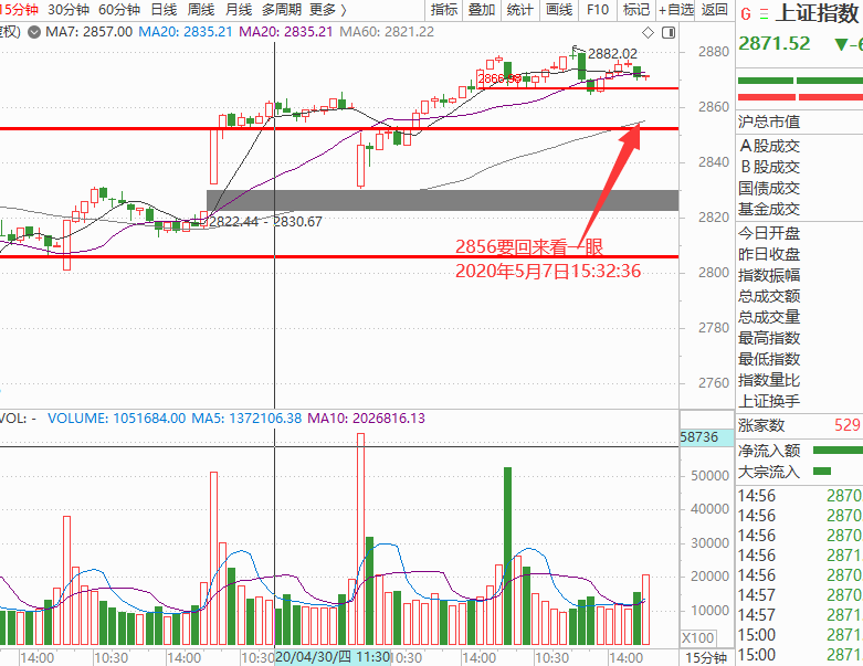 中午午评的时候观点是突破昨天高点成交量没有跟上,难以继续上行,有回调的需求,果不其然下午开盘既进入回调状态直到13:30有个反弹,然而再次到了反弹放量阴线位置受阻,时间最后30分钟勉强收出日线的阴线十字星,图形上看对明天开盘不利,有回踩2856的需求。所以早盘果断提醒冲高的高开压力位的要减持,如图: