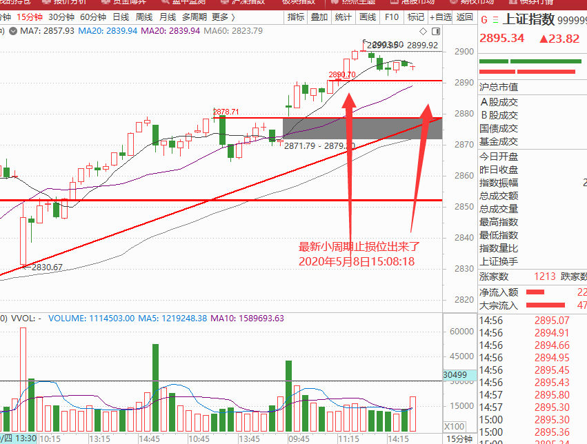 早盘15分钟、30分钟上攻后在30分钟收盘的成交耳朵703亿,这个没有达标900亿,所以我盘中提醒今天不会走出节后第一天的上攻量,并且下午在冲击2900点之后如期进入小幅的回调,如图: