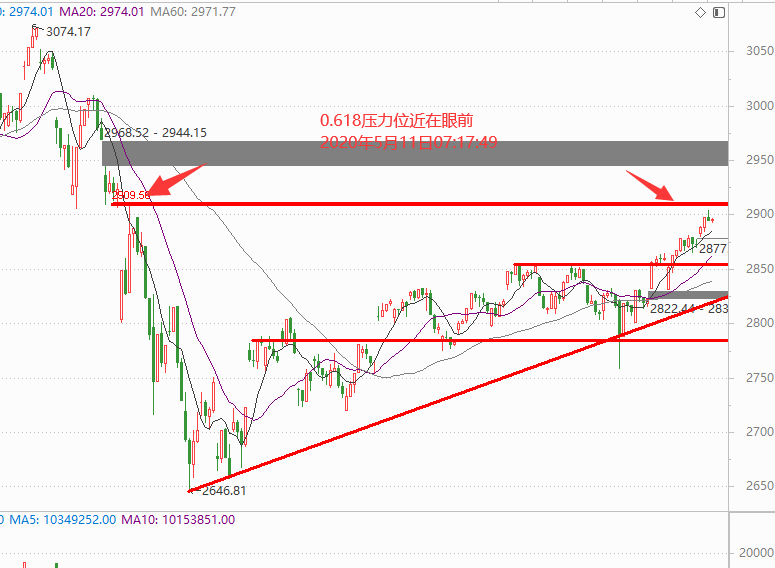 我们再来看看大盘,三大板块创业板、中小板强于上证主板,前面两个板块已经反弹到了0.809的位置,而主板上周在0.618位置受阻,后市的猜想最好是在目前位置上方震荡盘整最好,因为60、30分钟远离均线了,这时候也是获利盘离场的会加多,个股底部启动或者盘整后再次上均线的不少,没有必要追涨杀跌,如图: