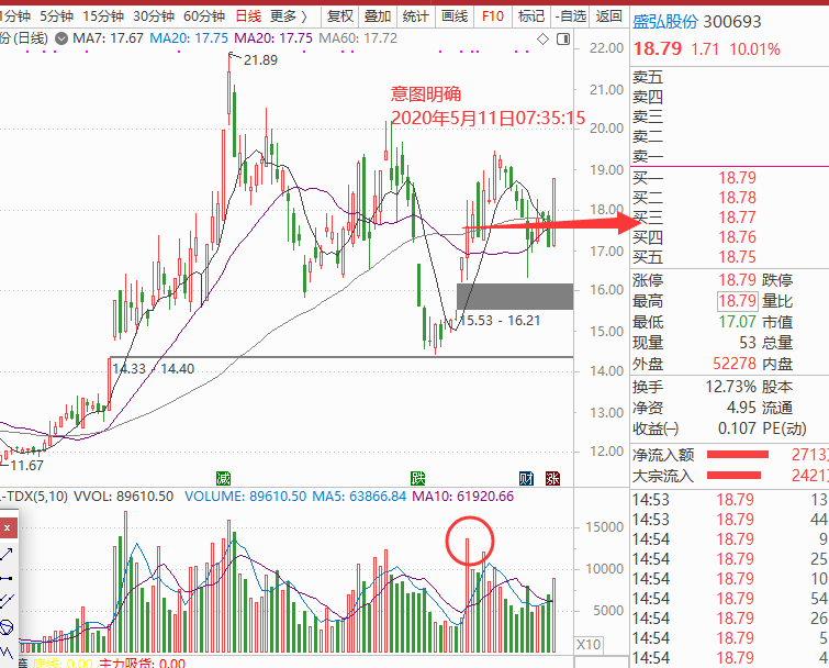 电气设备中的盛弘股份300693自从去年12月到目前经过一波涨幅之后上周五一箭穿心涨停上行,主力意图明确,而且站上了无敌量上方,业绩优秀,第一季报同比增涨538%,可重点关注,如图: