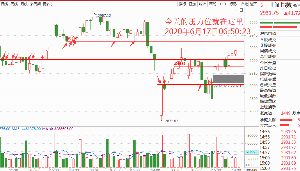 谈笑间上证再次来到了压力位,其实很多朋友对压力位的概念是模糊的,说的更形象点所谓的压力位或者支撑位置其实就是记忆停留,当市场参与者在到达某个位置的时候会群体断路,或者群体叛变,形成群体的抛售或者买进的动作,而当市场经过反向运行再次来到这个位置的时候就形成了支撑和压力,所以就有了经历的点位次数越多这个压力位或者支撑位就越有效,如图: