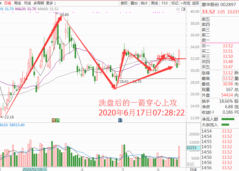 昨天华为受消息影响板块多只个股涨停,涨停个股12只,其中前期老一长信科技是二次上穿,放量上攻,不太理想的是前方压力位距离较近,意华股份002897技术图形有二次上穿和二次封板,业绩也有转变,无敌量转折信号明显,前面压力位套牢盘较少,可重点关注,如图: