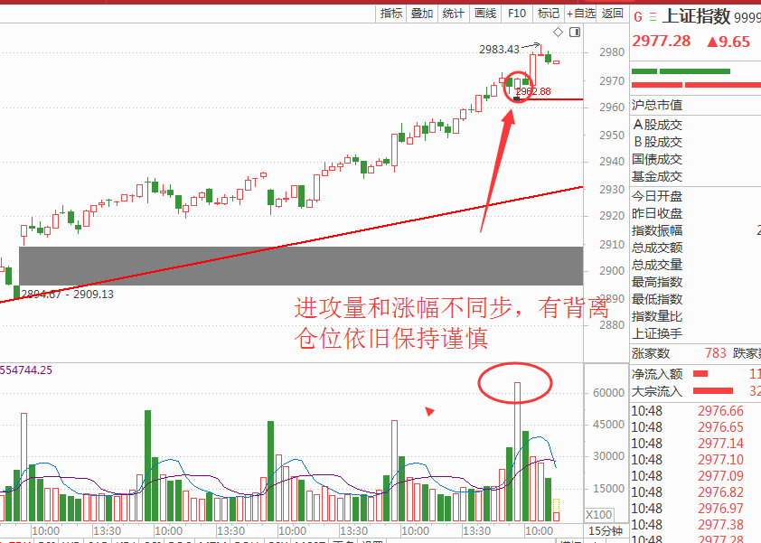 这时候我提醒朋友们这里是个骗线,下跌成交量大但是跌幅不大,很大概率是主力资金借机洗盘吸筹,果不其然话音未落已经强势反攻大盘收红,在15分钟收盘的时候成交额已经远远大于上攻量390亿,30分钟更是大于标准910亿上百亿,达到了1068亿,依旧是量能到了幅度不到,如图: