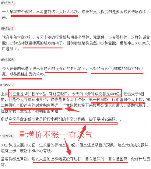 这时候我提醒朋友们这里是个骗线,下跌成交量大但是跌幅不大,很大概率是主力资金借机洗盘吸筹,果不其然话音未落已经强势反攻大盘收红,在15分钟收盘的时候成交额已经远远大于上攻量390亿,30分钟更是大于标准910亿上百亿,达到了1068亿,依旧是量能到了涨幅度不到,所以反复提醒朋友们要做好应对不要追涨,如图:
