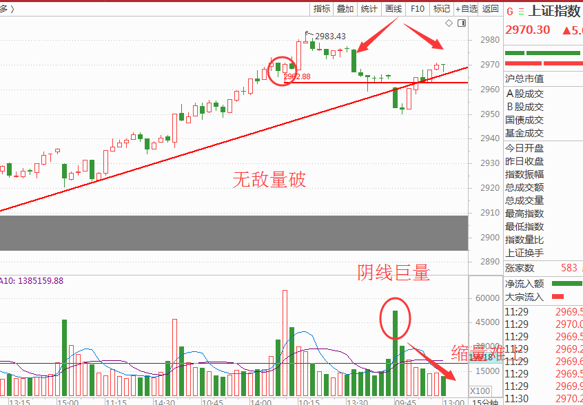 午评全部收红,不用追,今天要做的是冲高减仓,只要有无敌量下破反弹减仓都是正确的,下午大概率在2972点附近见顶回调,回调的支撑依旧是2948点附近,震荡行情高抛低吸是王道,如图: