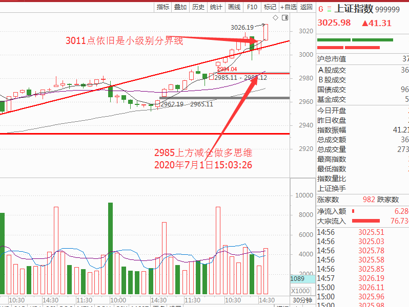 盘中开盘有个放量上攻的3011点位,我提示朋友们这里破了要主动减仓,而有朋友看到尾盘上来就有买回来的冲动,但是我给的意见是:接近收盘时间到又翻身上了日内高点附近,这时候已经形同鸡肋,没有参与的意义,