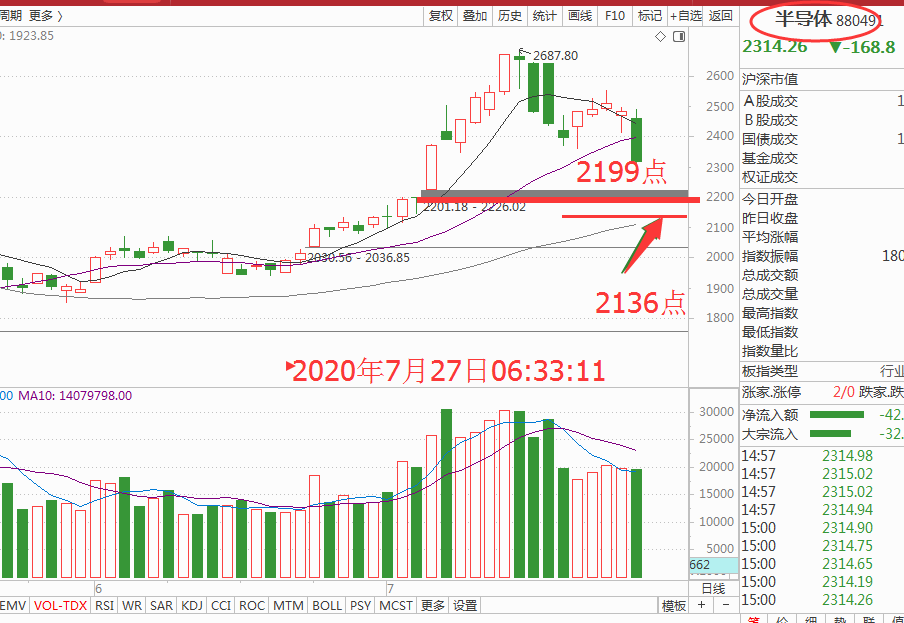 技术形态上半导体板块也是紧随大盘,回调到行业指数第一支撑2199点,第二支撑点2136点是正常的,如图: