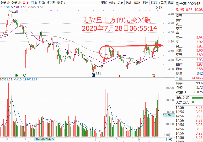市场每天都有机会,昨天复盘还是有不少符合我们进场条件的公司,只是在加剧震荡的行情中要坚守自己的信念和操作规则,复盘看到昨天强势板块防治板块中潮宏基002345莫名的就突破了,而且技术图形完美的站上了无敌量上方,可以重点跟踪一下,如果跳空超过3个点以上就谨慎对待,如图: