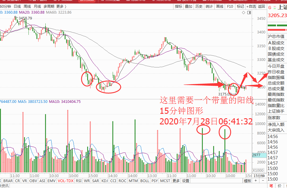 板块上上涨和下跌的板块全天都是出于一半一半对等数,涨停个股有78只跌停的有21只,市场总体来说有一部分优质公司会继续延续涨势,这时候的选股策略要偏重于业绩和半年报优秀的公司,技术上依旧需要一个额5分钟的放量阳线站上近期的最大量上方,如图: