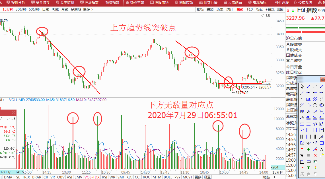 周一文章历史相似不相同从技术图形上也表现出来,不管是上涨还是下跌,一鼓作气再而衰三而竭,第二次下跌的时候空头的力量也就是抛压得到适当的释放,所以第二次下跌的成交量会跟之缩小,当然也可以理解为没有资金进场,但是只要你是多头思维就必须相信一条,那就是主力资金缩量洗盘行为,如下图: