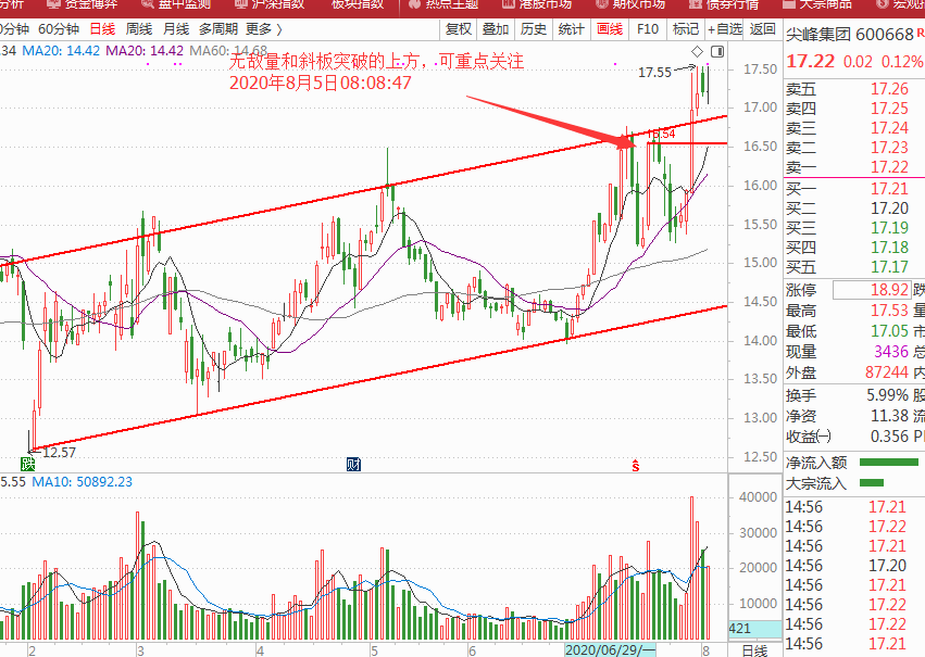 水泥板块的利好其实早就有讲,很多相关的公司已经涨幅超过40%,目前处于启动阶段的尖峰集团600668和宁波富达都是站上了无敌量,业绩也比较优秀,可重点关注,如图: