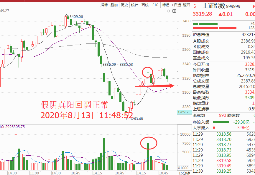 上午走势可以用一个成语“心知肚明”,这提醒在开盘的15分钟,昨天、前天的阴线大家都清楚不可能一口气上去的,但是受外围大涨的影响高开难免,那么昨天在喇叭口下沿低吸的部分资金也清楚,所以今天早晨趁机高抛做个T是很正常的,所以早盘就走出了高开低走的真阳假阴线。