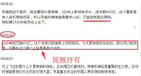 需要三驾马车领军上攻,早盘三大指数跳空高开后在第一个5分钟小幅回调,当时的观点是耐心等他,15分钟收出放量上攻的成交额达到了872亿,距离强势上攻的910亿稍微逊色,但是最起码这个量能是进攻型,所以我给出的观点,抓紧低吸,持股到收盘前十分钟做减持动作高抛,如图:
