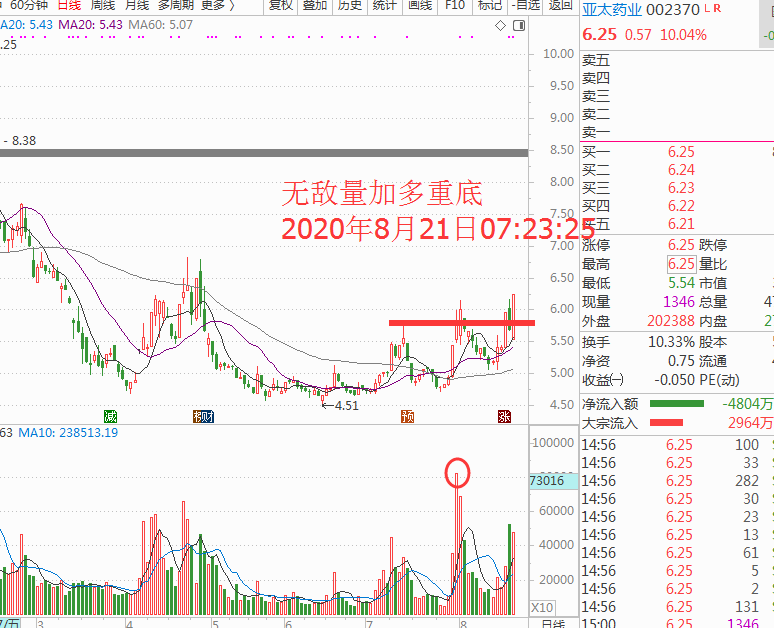 昨天涨停个股明显多于前个交易日,医药有三甲,半导体也有先行者,医药中的亚太医药是因为生产抗病毒性注射用治疗呼吸道感染药品,技术形态也是底部W低和无敌量共振可重点关注,如图: