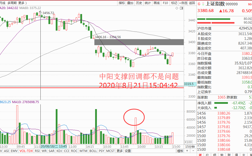 事实上早盘15分钟高开阳线不是第一信号,第一时间是5分钟阳线的成交额,在15分钟成交额645亿不多不少,太多有点过火,太少不足以撑起盘面,所以当时我提醒朋友们要把握低吸的机会,如图: