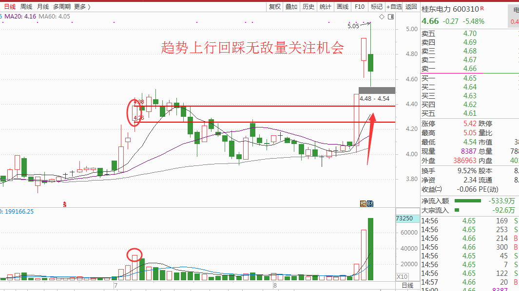 这更体现资金已经达到乱炒概念,反正逮着谁是谁,咬一口就跑。只要有资金推动就会延续趋势,从技术上看周五的阴线成交量较大,如果想参与那么在回踩5日和10日均价线的时候逐步建仓,并设定以20均价线做保护,仓位上更是保守为上,如图: